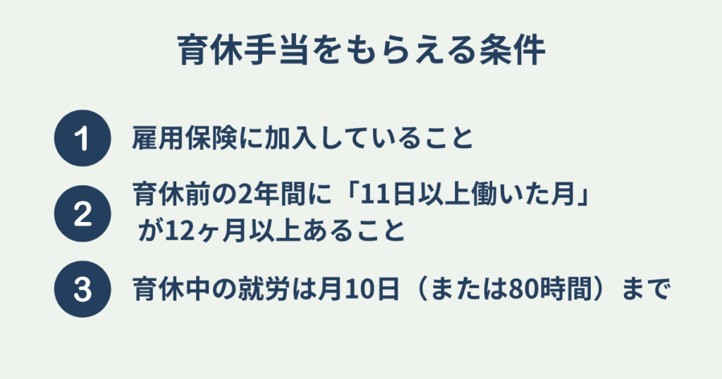 育休手当を受け取るには、いくつかの条件があります。会社員であれば多くの場合クリアできますが、念のため確認しておきましょう。